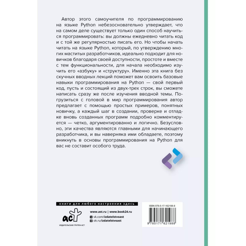 Эта книга в кратчайшие сроки поможет на базовом уровне освоить Python идеальный для новичка, доступный и понятный язык программирования, позволяющий легко создавать интересные и креативные приложения. Буквально с первых страниц читатель, даже если он никогда в жизни не писал код, с легкостью начнет постигать Python и на основе простых практических заданий приступит к написанию собственных программ, сначала состоящих из двух-трех строк кода, а затем, по мере усвоения базовых навыков программирования, все более сложных. Информация в книге изложена простым языком, четко, последовательно и логично, с изрядной долей юмора, поэтому учебный материал легко воспринимается и запоминается. Делая упор на самом главном, автор книги предоставляет читателю основные знания о переменных, типах и структурах данных, функциях, циклах, логических выражениях и отладке программ, сразу же иллюстрируя теорию подробно прокомментированными практическими примерами.