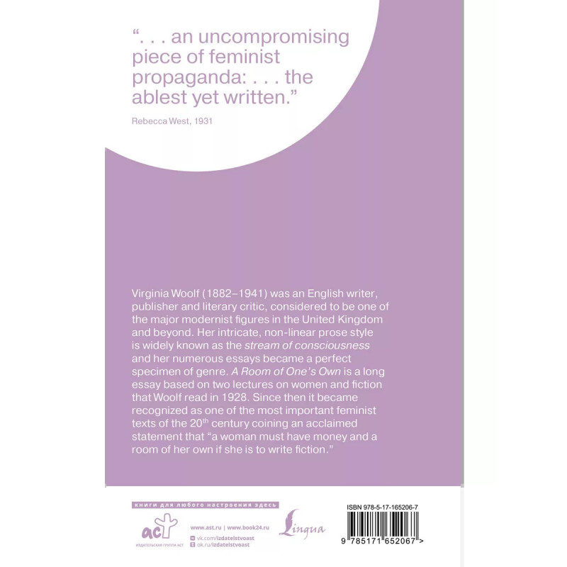 Вирджиния Вулф (18821941) английская писательница, издатель и литературный критик. Вулф признана одной из важнейших фигур модернизма: ее изысканный нелинейный стиль повествования получил известность как "поток сознания", а многочисленные эссе и критические статьи признаны образцами жанра. "Своя комната" эссе, выросшее из двух лекций, прочитанных Вулф студентам Кембриджа в 1928 году, которое ныне считается одним из самых значимых феминистских текстов двадцатого века. Именно в нем Вулф провозгласила, что "если женщина хочет писать книги, ей понадобятся деньги и собственная комната". Текст эссе публикуется на английском языке без сокращений и адаптации.
