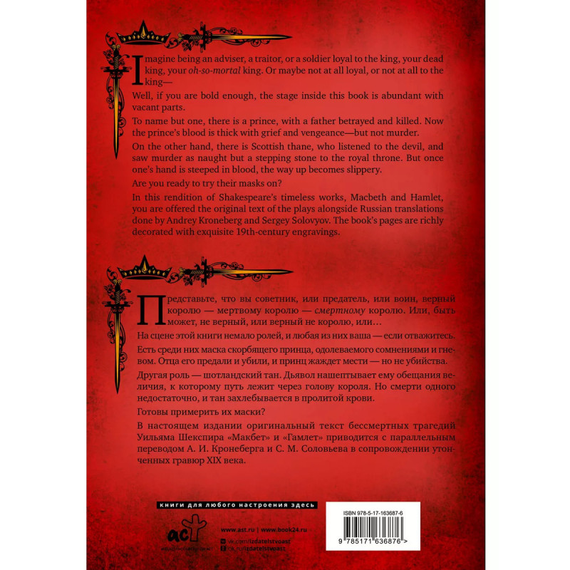 Представьте, что вы советник, или предатель, или воин, верный королю мертвому королю смертному королю. Или, быть может, не верный, или верный не королю, или На сцене этой книги немало ролей, и любая из них ваша если отважитесь. Есть среди них маска скорбящего принца, одолеваемого сомнениями и гневом. Отца его предали и убили, и принц жаждет мести но не убийства. Другая роль шотландский тан. Дьявол нашептывает ему обещания величия, к которому путь лежит через голову короля. Но смерти одного недостаточно, и тан захлебывается в пролитой крови. Готовы примерить их маски? В настоящем издании оригинальный текст бессмертных трагедий Уильяма Шекспира "Макбет" и "Гамлет" приводится с параллельным переводом А. И. Кронеберга и С. М. Соловьева в сопровождении утонченных гравюр XIX века, выполненных такими мастерами как Кенни Мидоус, Джон Гилберт и Генри Силус, а также гравюрами из иллюстрированного издания Шекспира под редакцией Чарльза Найта.