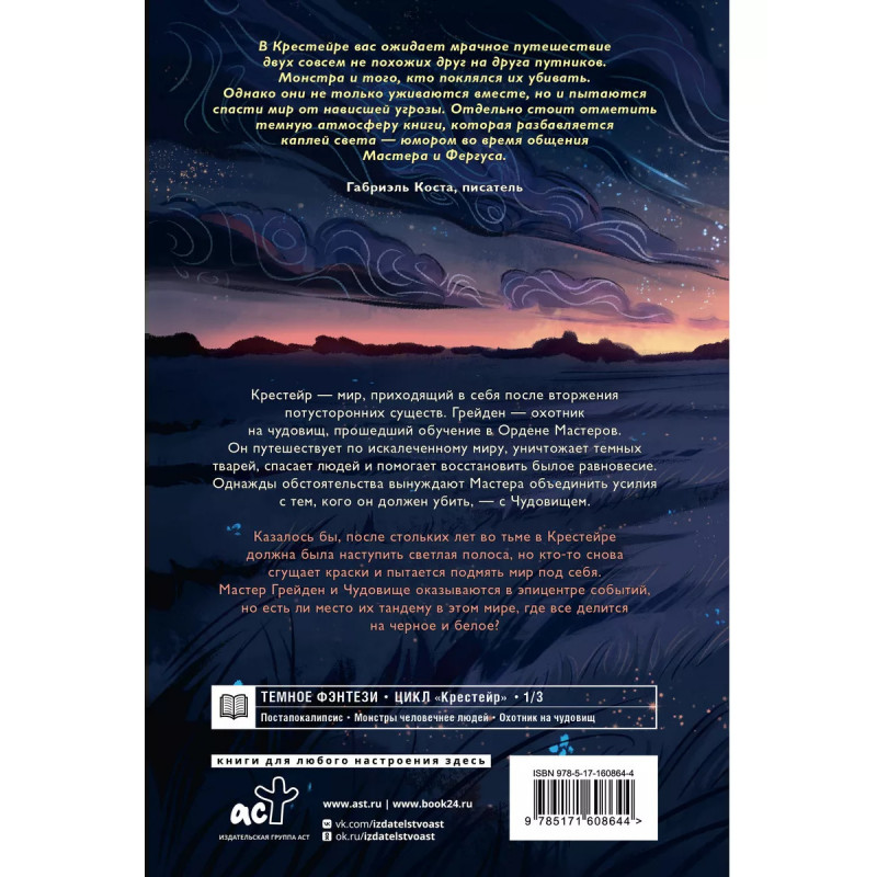 Крестейр. Начало. Крестейр - мир, приходящий в себя после вторжения потусторонних существ. Грейден - охотник на чудовищ, прошедший обучение в Ордене Мастеров. Он путешествует по искалеченному миру, уничтожает темных тварей, спасает людей и помогает восстановить былое равновесие. Однажды обстоятельства вынуждают Мастера объединить усилия с тем, кого он должен убить, - с Чудовищем. Казалось бы, после стольких лет во тьме в Крестейре должна была наступить светлая полоса, но кто-то снова сгущает краски и пытается подмять мир под себя. Мастер Грейден и Чудовище оказываются в эпицентре событий, но есть ли место их тандему в этом мире, где все делится на черное и белое?