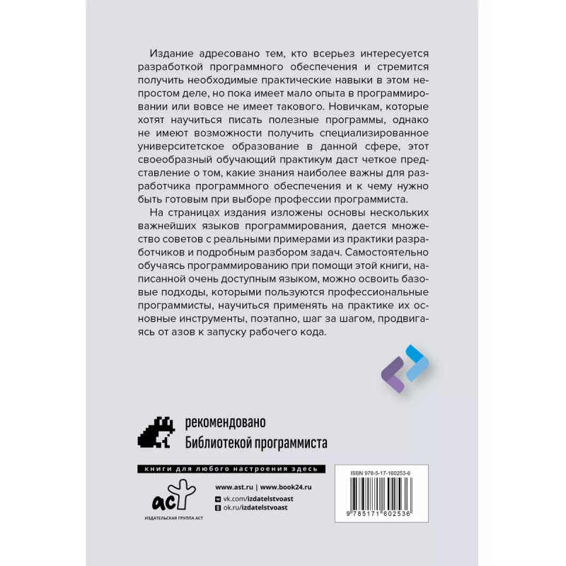 Данное издание адресовано тем, кто всерьез интересуется разработкой программного обеспечения и стремится получить необходимые практические навыки в этом непростом деле, но пока имеет мало опыта в программировании или вовсе не имеет такового. Новичкам, которые хотят научиться писать рабочие коды, однако пока не имеют возможности получить специализированное университетское образование в данной сфере, этот своеобразный обучающий практикум даст четкое представление о том, какие знания наиболее важны для разработчика ПО и к чему нужно быть готовым при выборе профессии программиста. Самостоятельно обучаясь программированию при помощи этой книги, написанной простым и доступным языком, можно освоить базовые подходы, которыми пользуются профессиональные программисты, научиться применять на практике их основные инструменты, поэтапно, шаг за шагом продвигаясь от азов к запуску рабочего кода. В страницах издания изложены основы нескольких важнейших языков программирования, дается множество практических советов с реальным