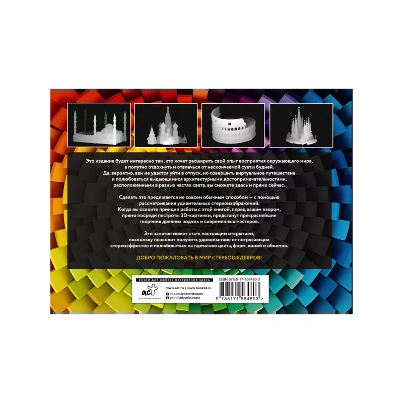Новый взгляд на мир. 75 стереограмм. Тренировка и восстановление зрения. Это издание будет интересно тем, кто хочет расширить свой опыт восприятия окружающего мира, а попутно отдохнуть и отвлечься от нескончаемой суеты будней. Да, вероятно, вам не удастся уйти в отпуск, но совершить виртуальное путешествие и полюбоваться выдающимися архитектурными достопримечательностями, расположенными в разных частях света, вы сможете здесь и прямо сейчас. Сделать это предлагается не совсем обычным способом - с помощью рассматривания удивительных стереоизображений. Когда вы освоите принцип работы с этой книгой, перед вашим взором, прямо посреди пестроты 3D-картинки, предстанут прекраснейшие творения древних зодчих и современных мастеров. Это занятие может стать настоящим открытием, поскольку позволит получить удовольствие от потрясающих стереоэффектов и полюбоваться на гармонию цвета, форм, линий и объемов. Добро пожаловать в мир стереошедевров!