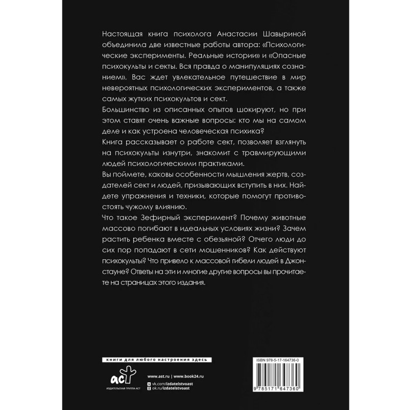 Настоящая книга психолога Анастасии Шавыриной объединила две известные работы автора: "Психологические эксперименты. Реальные истории" и "Опасные психокульты и секты. Вся правда о манипуляциях сознанием". Вас ждет увлекательное путешествие в мир невероятных психологических экспериментов, а также самых жутких психокультов и сект. Большинство из описанных опытов шокируют, но при этом ставят очень важные вопросы: кто мы на самом деле и как устроена человеческая психика? Книга рассказывает о работе сект, позволяет взглянуть на психокульты изнутри, знакомит с травмирующими людей психологическими практиками. Вы поймете, каковы особенности мышления жертв, создателей сект и людей, призывающих вступить в них. Найдете упражнения и техники, которые помогут противостоять чужому влиянию. Что такое Зефирный эксперимент? Почему животные массово погибают в идеальных условиях жизни? Зачем растить ребенка вместе с обезьяной? Отчего люди до сих пор попадают в сети мошенников? Как действуют психокульты?