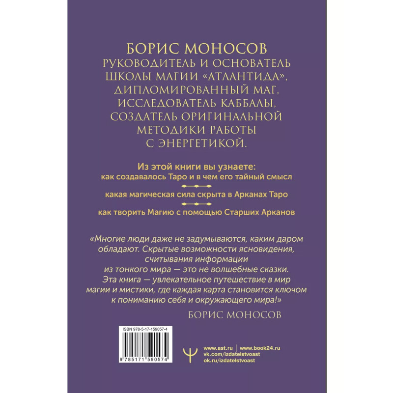 Первоначально, Таро или Тарот самая первая колода игральных карт, которая содержала священный текст на древнем языке. Эти знания были переданы в Египет после гибели Атлантов, а оттуда дошли уже до нас. Изучив "Священную книгу Тота", маг и учитель экстрасенсов, Борис Моносов рассказывает о тайных ключах, благодаря которым читатель сможет "прочесть" содержание каждой карты. В книге представлен уникальный подход к трактовкам Арканов, и, узнав про него, вы сможете не просто интерпретировать расклады, а ощущать их на совершенно новом уровне. Ведь в первую очередь автор расскажет, как использовать Таро для самопознания, а дальше вам открыты любые дороги. Из этой книги вы узнаете: как создавалось Таро и в чем его скрытые смыслы; как работать с Большими Арканами; как использовать ритуальную магию; какую тайну хранят Малые Арканы; как творить Вызывательную Магию с помощью Старших Арканов; какие инструменты нужны магам разных категорий и многое другое!