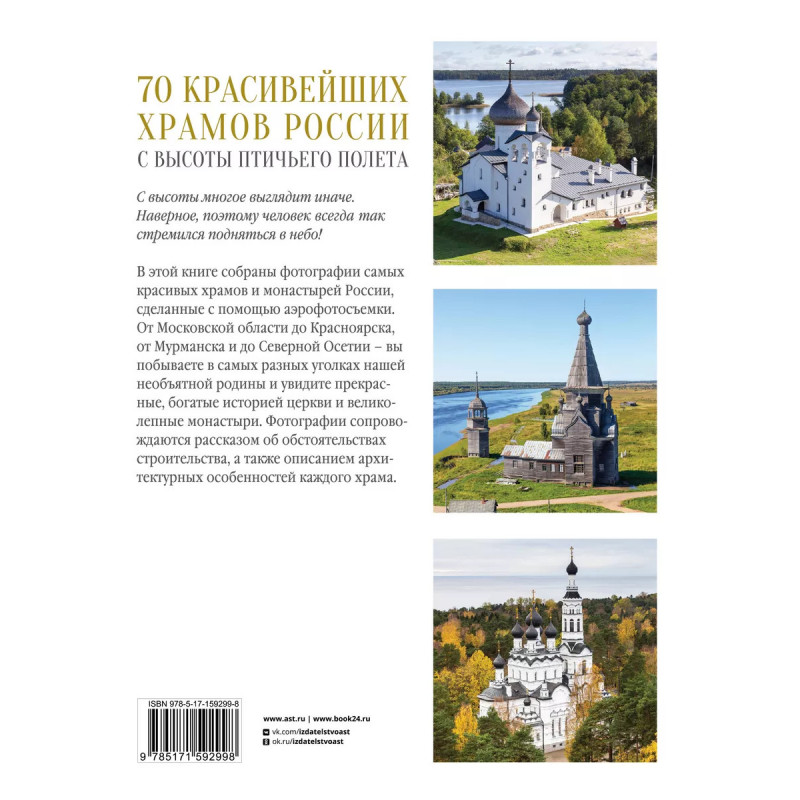 70 красивейших храмов России с высоты птичьего полета. Погорельский Михаил при участии Булычевой Екатерины. Благодарность Рязанову Владимиру. С высоты многое выглядит иначе. Наверное, поэтому человек всегда так стремился подняться в небо! В этой книге собраны фотографии самых красивых храмов и монастырей России, сделанные с помощью аэрофотосъемки. От Московской области до Красноярска, от Мурманска и до Северной Осетии - вы побываете в самых разных уголках нашей необъятной родины и увидите прекрасные, богатые историей церкви и великолепные монастыри. Фотографии сопровождаются рассказом об обстоятельствах строительства, а также описанием архитектурных особенностей каждого храма.