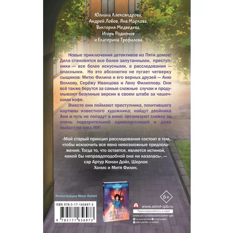 Детективное агентство Мити Филина снова в деле! Четырех сыщиков Митю Филина, Аню Волкову, Лену Филиппову и Серёжу Иванцова ждут новые приключения. Загадки будут все сложнее, преступники хитрее, а расследования все более рискованными. Но это совершенно не пугает опытных детективов из Пяти домов! Они уже строят самые безумные теории и версии в своем главном штабе. Ребятам предстоит поймать преступника, похитившего картины известного художника; найти двойника Ани и чуть не попасть в кино; выйти на шпиона и даже самим успеть организовать слежку за очень подозрительной одноклассницей.