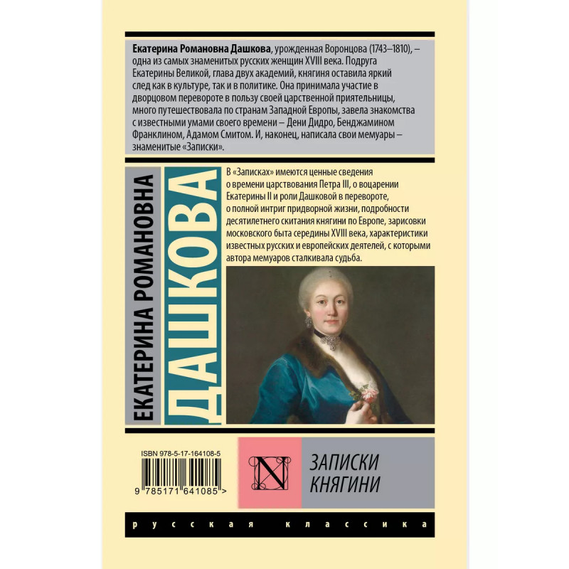 Екатерина Романовна Дашкова, урожденная Воронцова (1743-1810) одна из самых знаменитых русских женщин XVIII века. Подруга Екатерины Великой, глава двух академий, княгиня оставила яркий след как в культуре, так и в политике. Она принимала участие в дворцовом перевороте в пользу своей царственной приятельницы, много путешествовала по странам Западной Европы, завела знакомства с известными умами своего времени Дени Дидро, Бенджамином Франклином, Адамом Смитом. И, наконец, написала свои мемуары знаменитые "Записки". В "Записках" имеются ценные сведения о времени царствования Петра III, о воцарении Екатерины II и роли Дашковой в перевороте, о полной интриг придворной жизни, подробности десятилетнего скитания княгини по Европе, зарисовки московского быта середины XVIII в., характеристики известных русских и европейских деятелей, с которыми автора мемуаров сталкивала судьба.