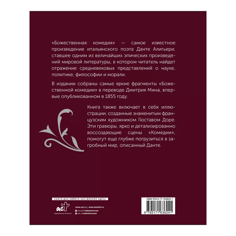 "Божественная комедия" последнее произведение итальянского поэта Данте Алигьери, являющееся одним из величайших эпических произведений мировой литературы, в котором нашли отражение средневековые представления о науке, политике, философии и морали. В этом издании собраны самые яркие фрагменты произведения в переводе Дмитрия Мина, а иллюстрации, созданные Гюставом Доре, помогут читателю еще глубже погрузиться в мир страданий и спасения, описанный Данте.