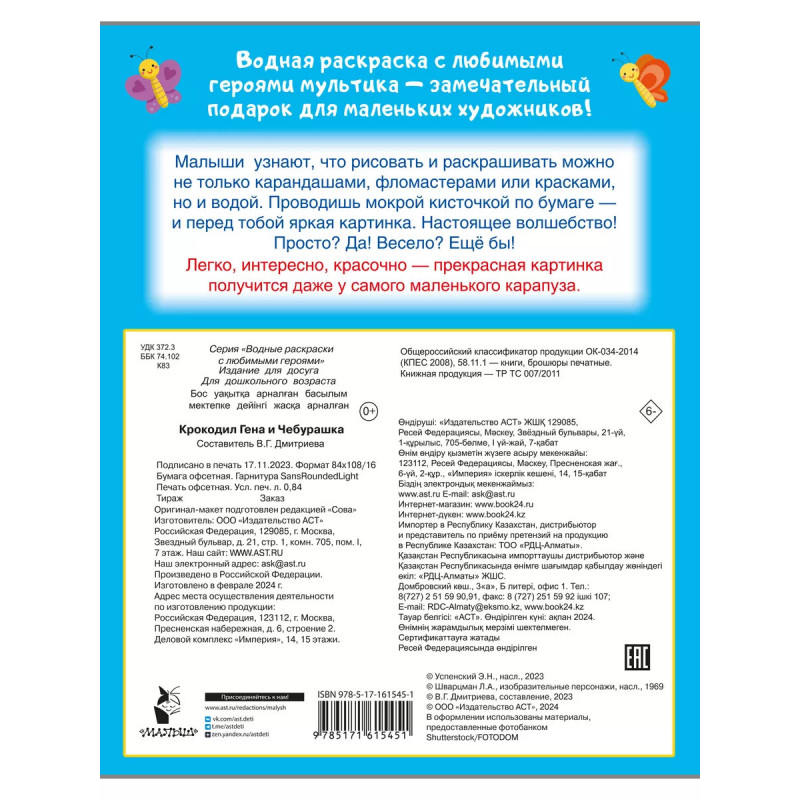 В серии Водные раскраски с любимыми героями картинки из любимого мультика! На страницах Чебурашка, Крокодил Гена и все-все-все. Лёгким движением руки обычный рисунок превращается в настоящий шедевр! Малышу понадобится одна лишь влажная кисточка и, конечно же, хорошее настроение. Водная раскраска это простая техника для решения сложных задач: ребёнок учится концентрировать внимание, получает представление о форме и цвете, тренирует мелкую моторику и, конечно, радуется, глядя на свой рисунок. Картинка не может не получиться! Замечательные иллюстрации из любимых мультиков. Развивающие задания. Качественная бумага. Удобный для ребёнка размер книги. Благодаря ярким и весёлым рисункам каждое задание станет маленькой игрой. Раскрашивать картинки водой не только увлекательное, весёлое, но и очень полезное занятие. Развиваем мелкую моторику и оттачиваем координацию движений: малыш учится аккуратно проводить мокрой кисточкой по областям для раскрашивания; расширяем кругозор обсуждаем сюжеты и любимых п