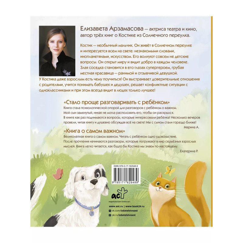 Елизавета Арзамасова актриса театра и кино, телеведущая. Наиболее известна по роли Галины Сергеевны в ситкоме "Папины дочки". "Стало проще разговаривать с ребёнком" Книга стала психологической опорой для разговоров с ребёнком о важном. Мой сын замкнутый, никак не могла расположить его, чтобы он раскрылся. В книге как раз поднимаются вопросы, которые интересовали ребёнка! Несколько вечеров провели, читая книгу и душевно обсуждая всё на свете! Мы с сыном стали гораздо ближе! Марина А. Можно ли увидеть искусство в разводах от краски? Как не потерять веру в людей? Можно ли передать привет инопланетянам с помощью пакета от кефира? Почему люди иногда добрее к животным, чем к людям? Вместе с друзьями Костик познаёт мир и находит ответы на самые невероятные вопросы. Костик вдохновляется жизнью, которая происходит в его Солнечном переулке, и заражает всех вокруг добротой и отзывчивостью.