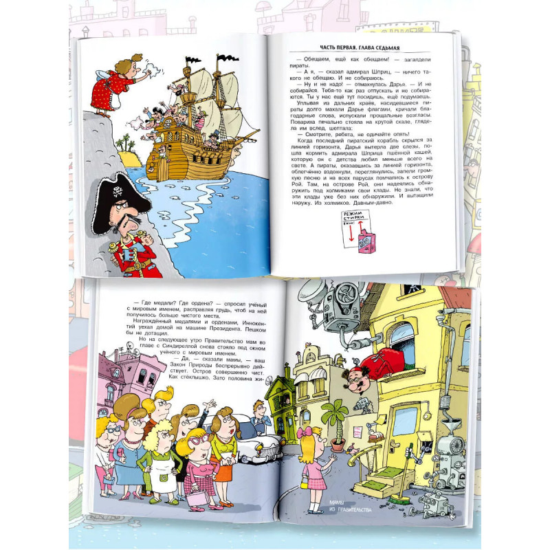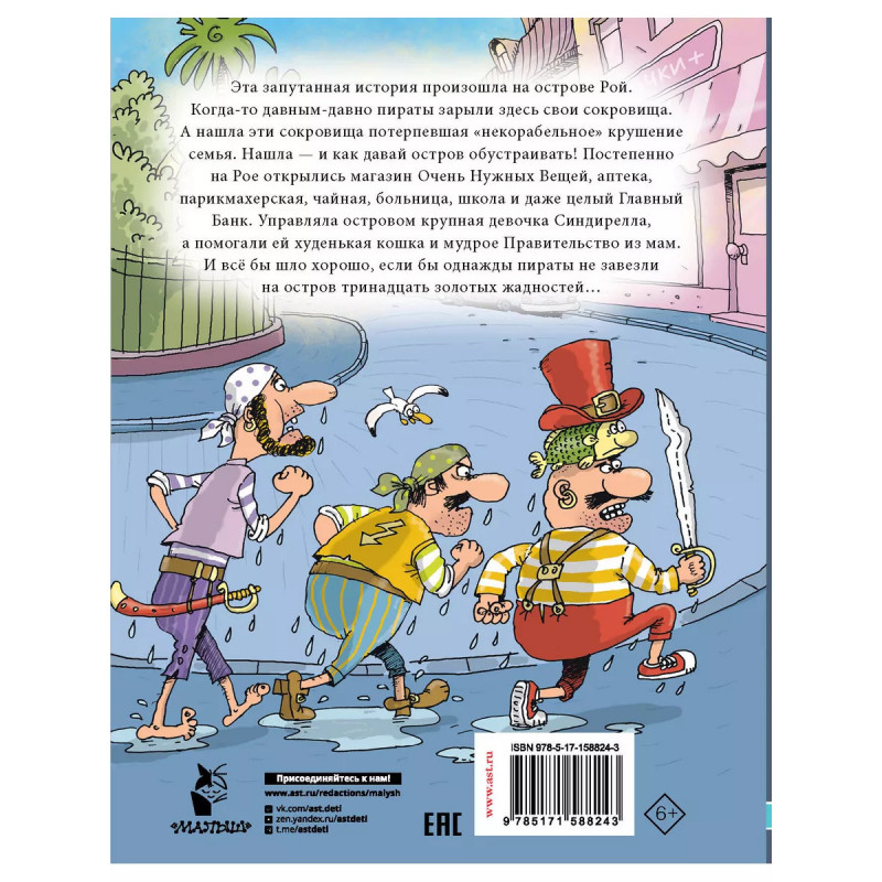 Робинзон и тринадцать жадностей. Рис. Н. Воронцова. Эта запутанная история произошла на острове Рой. Когда-то давным-давно пираты зарыли здесь свои сокровища. А нашла эти сокровища потерпевшая "некорабельное" крушение семья. Нашла - и как давай остров обустраивать! Постепенно на Рое открылись магазин Очень Нужных Вещей, аптека, парикмах@pская, чайная, больница, школа и даже целый Главный Банк. Управляла островом крупная девочка Синдирелла, а помогали ей худенькая кошка и мудрое Правительство из мам. И всё бы шло хорошо, если бы однажды пираты не завезли на остров тринадцать золотых жадностей