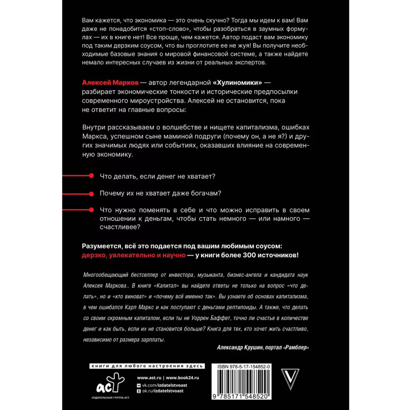 Капитал. Как сколотить капитал, как его не потерять, и почему нам его так не хватает. Вам кажется, что экономика - это очень скучно? Тогда мы идем к вам! Вам даже не понадобится "стоп-слово", чтобы разобраться в заумных формулах - их в книге нет! Все проще, чем кажется. Автор подаст вам экономику под таким дерзким соусом, что вы проглотите ее не жуя! Вы получите необходимые базовые знания о мировой финансовой системе, а также найдете немало интересных случаев из жизни от реальных экспертов. Алексей Марков - автор легендарной "Хулиномики" - разбирает экономические тонкости и исторические предпосылки современного мироустройства. Алексей не остановится, пока не ответит на главные вопросы: - Что делать, если денег не хватает? - Почему их не хватает даже богачам? - Что нужно поменять в себе и что можно исправить в своем отношении к деньгам, чтобы стать немного - или намного - счастливее? Разумеется, все это подается под вашим любимым соусом: дерзко, увлекательно и научно - у книги более 300 источников! Внутри рассказываем о волшебстве и нищете капитализма, ошибках Маркса, успешном сыне маминой подр