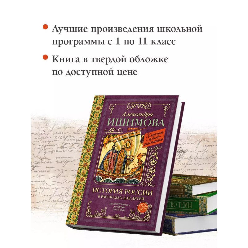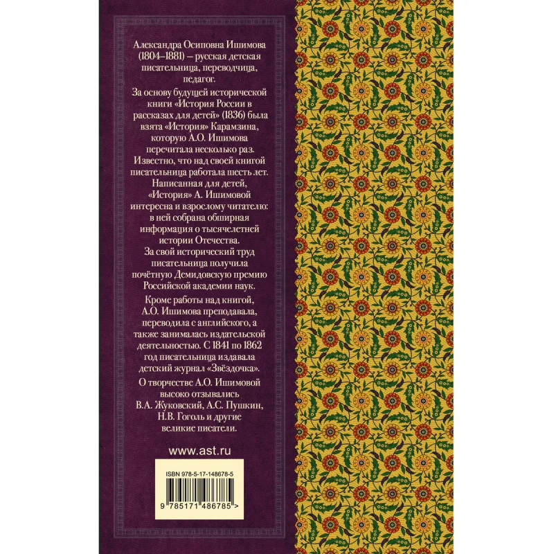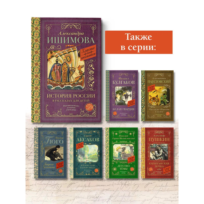 Думаете, как увлечь школьника историей России? История России для детей писательницы, преподавательницы и переводчицы Александры Осиповны Ишимовой легко заинтересует историей Отечества не только детей, но и взрослых. Вы узнаете о княгине Ольге и князе Владимире, смутном времени и блестящем дворе Екатерины Великой, итальянском походе Суворова и царствовании Александра I. История России никогда не была столь увлекательной! В серию включены лучшие произведения отечественной и зарубежной литературы, входящие в школьную программу с 1 по 11 класс и в списки дошкольного чтения. Книги в твердом переплёте сделают знакомство с литературой легким и увлекательным. Серия, которая не ударит по семейному бюджету и поможет юному читателю расти нравственно и интеллектуально!