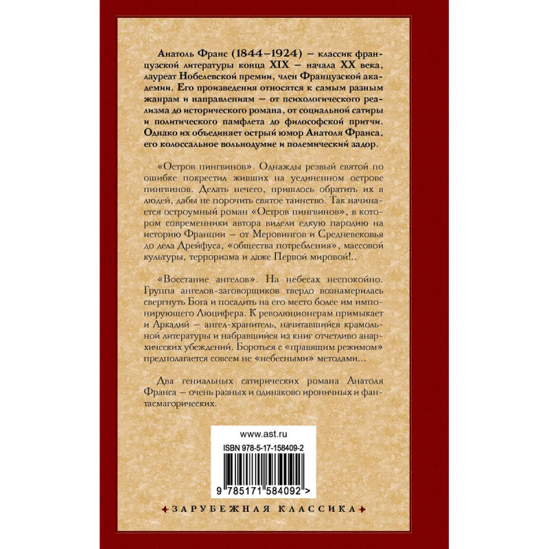 Остров пингвинов. Восстание ангелов. "Остров пингвинов". Однажды резвый святой по ошибке покрестил живших на уединенном острове пингвинов. Делать нечего, пришлось обратить их в людей, дабы не порочить святое таинство. Так начинается остроумный роман "Остров пингвинов", в котором современники автора видели едкую пародию на историю Франции - от Меровингов и Средневековья до дела Дрейфуса, "общества потребления", массовой культуры, терроризма и даже Первой мировой!.. На небесах неспокойно. Группа ангелов-заговорщиков твердо вознамерилась свергнуть Бога и посадить на его место более им импонирующего Люцифера. К революционерам примыкает и Аркадий - ангел-хранитель, начитавшийся крамольной литературы и набравшийся из книг отчетливо анархических убеждений. Бороться с "правящим режимом" предполагается совсем не "небесными" методами... Два гениальных сатирических романа Анатоля Франса - очень разных и одинаково ироничных и фантасмагорических.