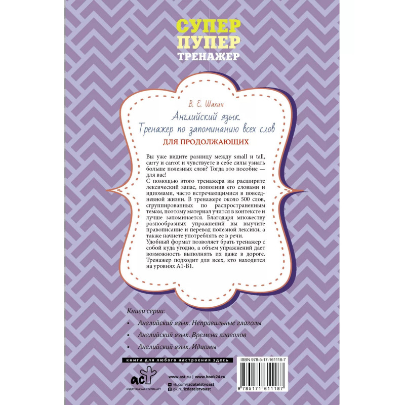 Английский язык. Тренажер по запоминанию всех слов для продолжающих. Вы уже уверенно знаете слова small и tall, carry и carrot и чувствуете в себе силы узнать больше полезных слов? Тогда это пособие - для вас! Пособие "Английский язык. Тренажер по запоминанию всех слов для продолжающих" - это продолжение популярного пособия "Английский язык. Тренажер по запоминанию всех слов для начинающих" от опытного преподавателя Валерии Евгеньевны Шахин. С помощью нового тренажера, в котором не повторяются слова из предыдущего, вы плавно расширите активный и пассивный лексический запас, пополнив его словами и идиомами, часто встречающимися в повседневной жизни. Тренажер содержит около 500 слов и выражений, сгруппированных по нескольким распространенным темам, поэтому материал учится в контексте и лучше запоминается. Благодаря множеству разнообразных упражнений вы выучите правописание и перевод полезной лексики, а также начнете употреблять ее в речи. Ключи к упражнениям представлены в конце пособия. Удобный формат позволяет брать тренажер с собой куда угодно, а объем упражнений дает возможн