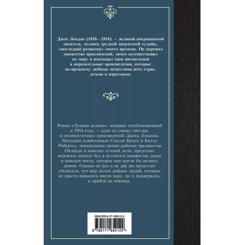 Роман "Лунная долина", впервые опубликованный в 1914 году одно из самых светлых и оптимистичных произведений Джека Лондона. Молодым влюбленным Саксон Браун и Биллу Робертсу, покинувшим нищие рабочие предместья Окленда в поисках лучшей доли, предстоит пережить немало бед и истоптать множество дорог в поисках места, которое они могли бы назвать домом. Однако не раз и не два им предстоит убедиться, что мир полон добрых людей, готовых не просто пожалеть юную пару, но и поддержать, и прийти на помощь.