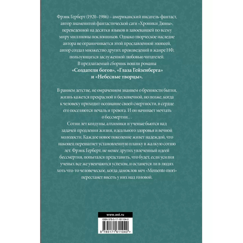 Глаза Гейзенберга. Фрэнк Герберт (1920-1986) - американский писатель-фантаст, автор знаменитой фантастической саги "Хроники Дюны", переведенной на десятки языков и завоевавшей по всему миру миллионы поклонников. Однако творческое наследие автора не ограничивается этой прославленной эпопеей, автор создал множество других произведений в жанре НФ, пользующихся заслуженной любовью читателей. В предлагаемый сборник вошли романы "Создатели богов", "Глаза Гейзенберга" и "Небесные творцы". В раннем детстве, не омраченном знанием о бренности бытия, жизнь кажется прекрасной и бесконечной, но позже, когда к человеку приходит осознание своей смертности, в сердце его поселяются печаль и тревога. И он начинает мечтать о бессмертии Сотни лет колдуны, алхимики и ученые бьются над задачей продления жизни, идеального здоровья и вечной молодости. Каждое новое поколение живет надеждой, что наконец перешагнет установленную планку в жалкую сотню лет. Фрэнк Герберт, не менее других увлеченный идеей бессмертия, попытался представить, что будет, если
