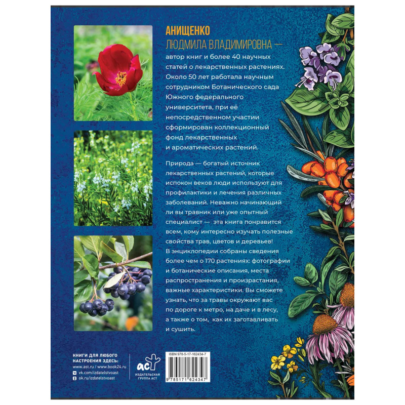 Анищенко Людмила Владимировна автор книг и более 40 научных статей о лекарственных растениях. Около 50 лет работала научным сотрудником Ботанического сада Южного федерального университета, при её непосредственном участии сформирован коллекционный фонд лекарственных и ароматических растений. Природа богатый источник лекарственных растений, которые испокон веков люди используют для профилактики и лечения различных заболеваний. Неважно начинающий ли вы травник или уже опытный специалист эта книга понравится всем, кому интересно изучать полезные свойства трав, цветов и деревьев! В энциклопедии собраны сведения более чем о 180 растениях: фотографии и ботанические описания, места распространения и произрастания, важные характеристики. Вы сможете узнать, что за травы окружают вас по дороге к метро, на даче и в лесу, а также о том, как их заготавливать и сушить.