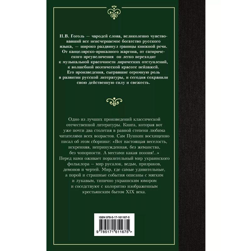 Вечера на хуторе близ Диканьки. Одна из первых и самых светлых работ Николая Васильевича Гоголя, написанная по мотивам украинского фольклора. Это острая сатира, ставшая одним из лучших произведений классической русской литературы. Николай Гоголь - знаковый отечественный писатель, внесший значительный вклад в развитие русской литературы.