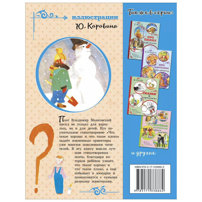 Выдающийся поэт Владимир Маяковский писал не только для взрослых, но и для детей. Его поучительное стихотворение "Что такое хорошо и что такое плохо" задаёт жизненные ориентиры уже многим поколениям читателей. Оригинальные рифмы, чёткий ритм и удивительное видение мира делают стихи Владимира Маяковского незаменимыми для детского чтения. В эту книгу вошли лучшие стихотворения поэта, благодаря которым ребёнок узнает, что такое хорошо и что такое плохо, а ещё побывает в зоопарке и познакомится с самыми разными животными. Для дошкольного возраста.