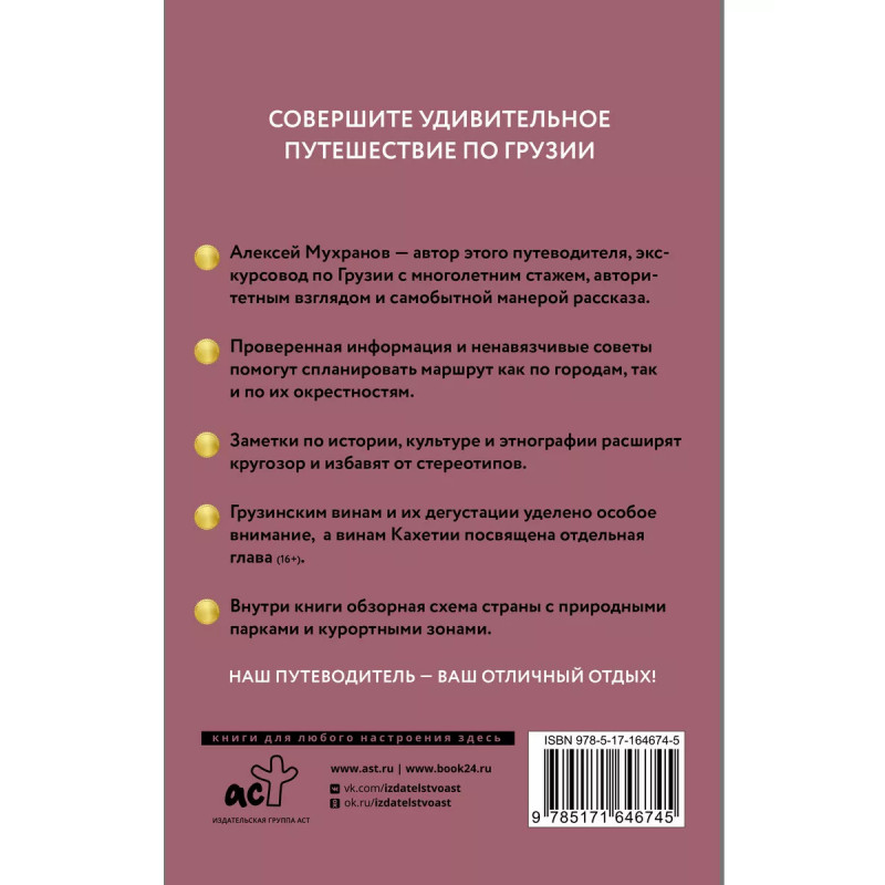В этом путеводителе вы найдете не только маршруты для путешествий на любой вкус по Центральной, Южной и Западной Грузии, но и множество советов и лайфхаков по гастрономическим и культурным путешествиям. В книге есть сведения об особенностях грузинской кухни и культуре еды теперь вам будет проще определиться с выбором блюд в местных кафе и вас не смутят названия шкмерули или эларджи. Вы научитесь правильно дегустировать знаменитые грузинские вина, а также станете поклонниками потрясающего местного кофе. Берите путеводитель Алексея Мухранова и отправляйтесь в путешествие по прекрасной Грузии незабываемые впечатления вам обеспечены.