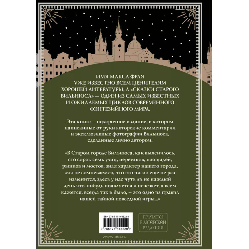 Имя Макса Фрая уже известно всем ценителям хорошей литературы, а "Сказки старого Вильнюса" один из самых известных и ожидаемых циклов современного фэнтезийного мира. Эта книга подарочное издание, в котором написанные от руки авторские комментарии и эксклюзивные фотографии Вильнюса, сделаны лично автором. "В Старом городе Вильнюса, как выяснилось, сто сорок семь улиц, переулков, площадей, рынков и мостов; зная характер нашего города, мы не сомневаемся, что это число еще не раз изменится, здесь у нас чуть ли не каждый день что-нибудь появляется и исчезает, а всем кажется, всегда так и было это одно из правил нашей тайной повседневной игры"