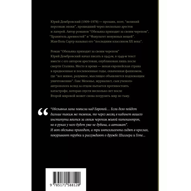 Обезьяна приходит за своим черепом. Новое издание культовой книги: старт серии "Юрий Домбровский: проза" Между страхом и свободой: философский роман о стойкости и предательстве в тоталитарном мире Детектив, где развязка известна с самого начала, но куда более захватывающими оказываются пути, ведущие героев в финальную точку.
