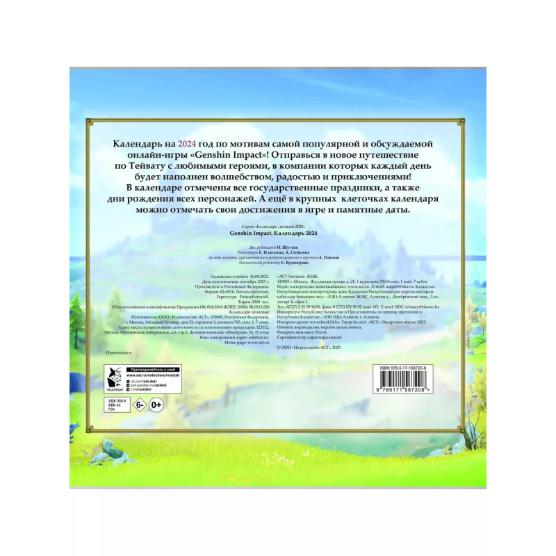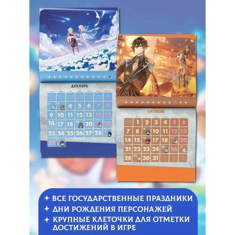 Календарь на 2024 год по мотивам самой популярной и обсуждаемой онлайн-игры "Genshin Impact"! Отправься в новое путешествие по Тейвату с любимыми героями, в компании которых каждый день будет наполнен волшебством, радостью и приключениями! В календаре отмечены все государственные праздники, а также дни рождения всех персонажей. А ещё в крупных клеточках календаря можно отмечать свои достижения в игре и памятные даты.
