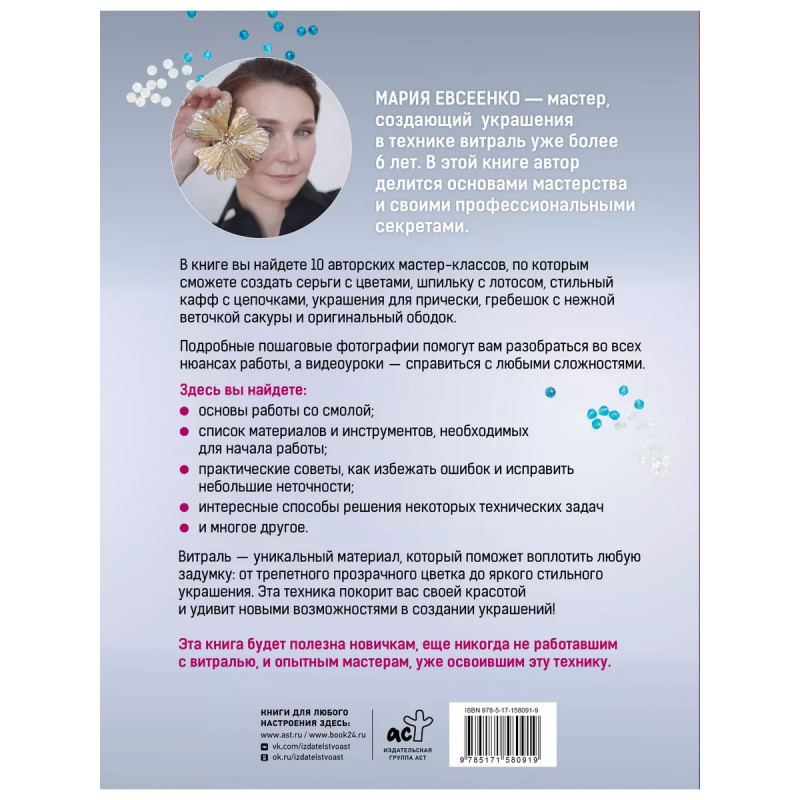 Книга "Аксессуары из витрали своими руками" подробное руководство по созданию уникальных украшений из смолы. В книге собрано 10 мастер-классов по созданию изысканных украшений. В ней вы найдёте подробное описание основ работы со смолой, советы по выбору необходимых для начала работы материалов и инструментов, а также ценные практические советы о том, как избежать распространенных ошибок. Эта книга станет незаменимым помощником для всех, кто хочет освоить технику витраль, раскрыть свой творческий потенциал и создавать неповторимые украшения.