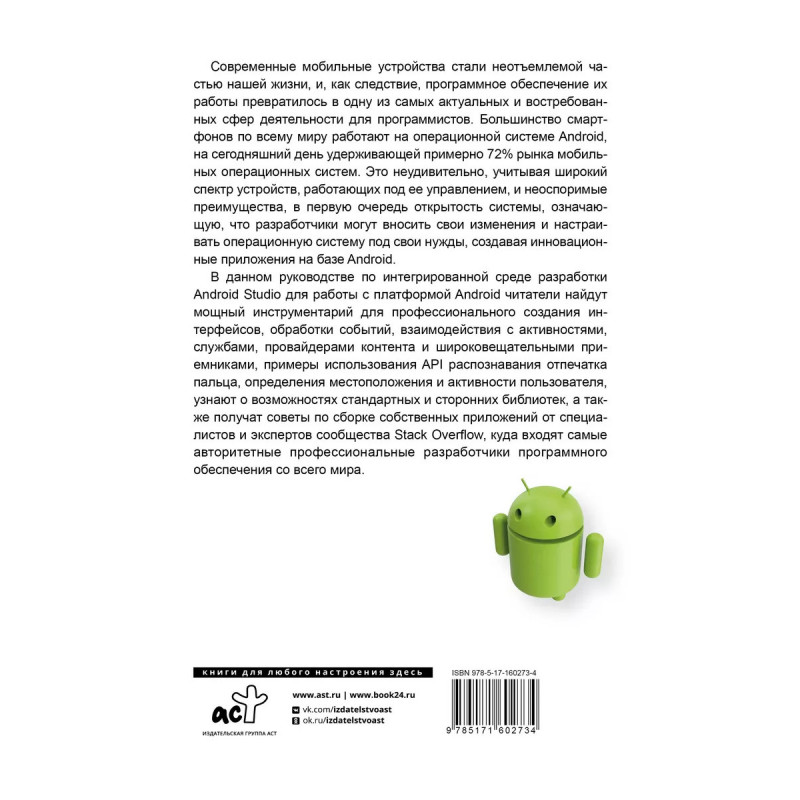 Большинство смартфонов по всему миру работают на операционной системе Android, на сегодняшний день удерживающей примерно 72% рынка мобильных операционных систем. Это неудивительно, учитывая широкий спектр устройств, работающих под ее управлением, и ее неоспоримые преимущества, в первую очередь открытость системы, означающую, что разработчики могут вносить свои изменения и настраивать ее под свои нужды, создавая инновационные приложения на базе Android. В данном руководстве по интегрированной среде разработки Android Studio для работы с платформой Android читатели найдут мощный инструментарий для профессионального создания интерфейсов, обработки событий, взаимодействия с активностями, службами, провайдерами контента и широковещательными приемниками, примеры использования API распознавания отпечатка пальца, определения местоположения и активности пользователя, узнают о возможностях стандартных и сторонних библиотек, а также получат советы по сборке собственных приложений от специалистов и экспертов.