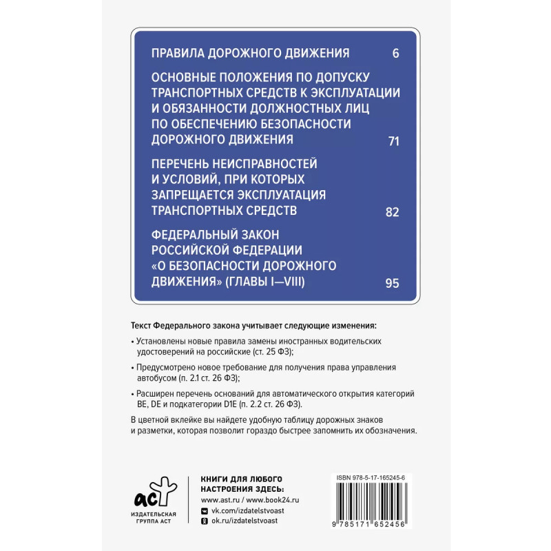 В издании содержится официальный текст Правил дорожного движения и Федерального закона от 10.12.1995 № 196-ФЗ "О безопасности дорожного движения", в котором учтены изменения и дополнения на 1 июля 2024 года. Книга дополняется цветной вклейкой, содержащей актуальную и удобную таблицу дорожных знаков и разметки, которая позволит быстро запомнить их обозначения. Текст Федерального закона учитывает изменения в части: условий получения права на управление транспортным средством; правил замены иностранных водительских удостоверений на российские. Издание рассчитано на кандидатов в водители, водителей, автоюристов и всех интересующихся дорожным движением. В текст книги внесены все изменения и дополнения, опубликованные в официальных источниках на момент подписания в печать.