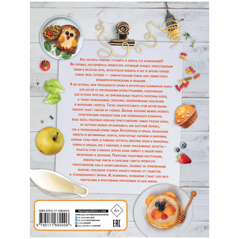 Чтобы ребенок заинтересовался кулинарией, следует превратить приготовление пищи в веселую игру. А если вовлечь в нее и других членов семьи, это будет замечательным поводом для совместного времяпрепровождения. Также вам может понадобиться кулинарная книга для детей, содержащая достаточно простые, но оригинальные рецепты с пошаговыми инструкциями. Такое издание мы вам и предлагаем. Его можно назвать практическим руководством для начинающего кулинара, ведь в книге подробно описано приготовление самых разных блюд, из которых можно организовать как быстрый перекус, так и полноценный прием пищи. Бутерброды и пиццы, аппетитные вареники и сырники, воздушные омлеты и витаминные салаты, нежные супы-пюре и румяные котлеты, вкусные каши и макароны, блины и оладьи, как у бабушки, и даже праздничные десерты рецепты этих и многих других блюд найдут в нашей книге мальчишки и девчонки.