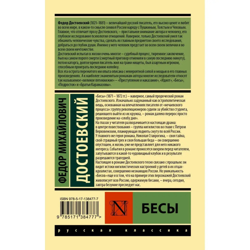 "Бесы" (1871-1872 гг.) наверное, самый пророческий роман Достоевского. Изначально задуманный как острополитическая вещь, основанная на впечатлениях писателя от "нечаевского процесса": группу революционеров судили за убийство студента, решившего выйти из их кружка, роман далеко перерос просто произведение на "злобу дня". На глазах у читателей разворачивается настоящая драма: в центре повестования группа нигилистов во главе с Петром Верховенским, планирующая поднять смуту по всей России. У главного же героя романа Николая Ставрогина своя тайна, свой страшный грех и своя большая беда он совершенно опустошен, и жизнь уже не представляет для него никакого интереса. События в романе проносятся вихрем перед читателем, запутываются в какой-то чудовищный клубок и в результате разрешаются трагедией. Настоящее в романе Достоевского тесно связано с прошлым: он видит истоки нигилистических настроений у детей в их отцах-идеалистах, совершенно не знающих России. Но уникальность "Бесов" еще и в том, что на примере
