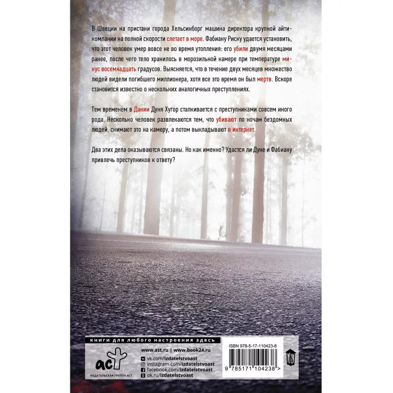 В Швеции на пристани города Хельсинборг машина директора крупной айти-компании на полной скорости слетает в море. Фабиану Риску удается установить, что этот человек умер вовсе не во время утопления: его убили двумя месяцами ранее, после чего тело хранилось в морозильной камере при температуре минус восемнадцать градусов. Выясняется, что в течение двух месяцев множество людей видели погибшего миллионера, хотя все это время он был мертв. Вскоре становится известно о нескольких аналогичных преступлениях. Тем временем в Дании Дуня Хугор сталкивается с преступниками совсем иного рода. Несколько человек развлекаются тем, что убивают по ночам бездомных людей, снимают это на камеру, а потом выкладывают в интернет. Два этих дела оказываются связаны. Но как именно? Удастся ли Дуне и Фабиану привлечь преступников к ответу?