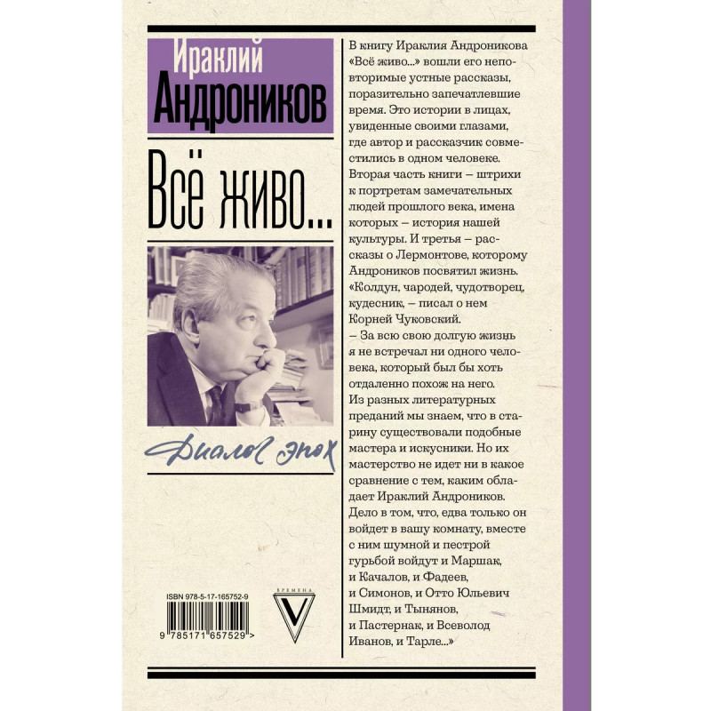 В книгу Ираклия Андроникова "Всё живо" вошли его неповторимые устные рассказы, поразительно запечатлевшие время. Это истории в лицах, увиденные своими глазами, где автор и рассказчик совместились в одном человеке. Вторая часть книги штрихи к портретам замечательных людей прошлого века, имена которых история нашей культуры. И третья рассказы о Лермонтове, которому Андроников посвятил жизнь. "Колдун, чародей, чудотворец, кудесник, писал о нем Корней Чуковский. За всю свою долгую жизнь я не встречал ни одного человека, который был бы хоть отдаленно похож на него. Из разных литературных преданий мы знаем, что в старину существовали подобные мастера и искусники. Но их мастерство не идет ни в какое сравнение с тем, каким обладает Ираклий Андроников. Дело в том, что, едва только он войдет в вашу комнату, вместе с ним шумной и пестрой гурьбой войдут и Маршак, и Качалов, и Фадеев, и Симонов, и Отто Юльевич Шмидт, и Тынянов, и Пастернак, и Всеволод Иванов, и Тарле"