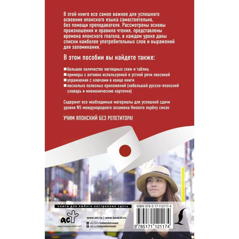 Пособие Японский язык без репетитора. Самоучитель японского языка А.Н. Сыщиковой (выходит в новой серии Иностранный без репетитора) содержит всё самое важное для успешного освоения японского языка самостоятельно. Рассмотрены основы произношения и правила чтения, представлены времена японских глаголов, в каждом уроке даны списки наиболее употребительных слов и выражений для запоминания. В этом пособии: - большое количество наглядных схем и таблиц; - примеры с активно используемой в устной речи лексикой; - разнообразные упражнения с ключами в конце книги; - несколько полезных приложений (небольшой русско-японский словарь и мнемонические карточки). Для широкого круга читателей, изучающих японский язык без преподавателя.