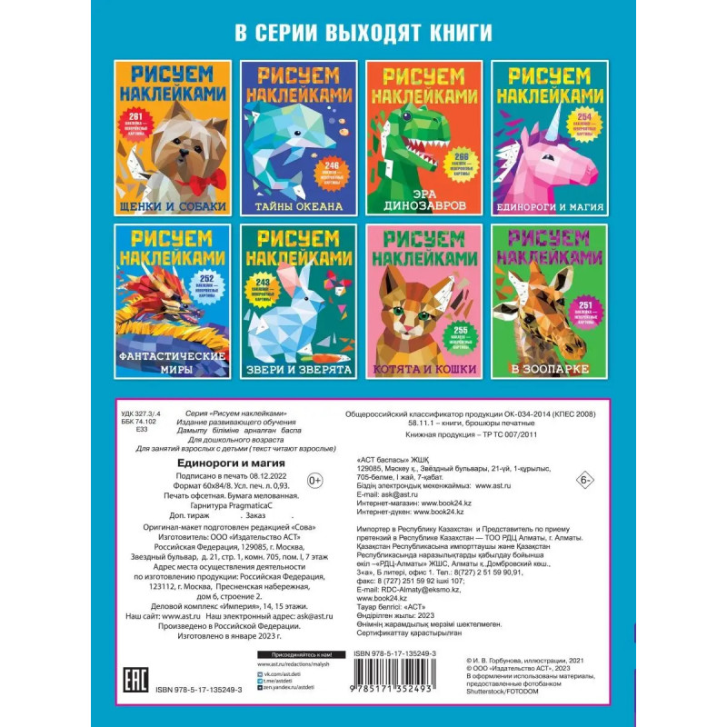 В новой серии книг Рисуем наклейками игровые задания с геометрическими стикерами, необыкновенно популярные во всем мире. В уникальной книжке ребята увидят единорогов, сказочную фею и волшебный замок, которых можно раскрасить стикерами, подобрав наклейки по номерам. Юным художникам обязательно понравятся интересные задания на развитие логики, памяти, внимания, мелкой моторики. Книжка для всех, кто любит рисовать и своими руками создавать коллажи из наклеек. Мозаики разделены на геометрические фигурки и напоминают пиксельные картинки. Подбираем нужные наклейки для каждого фрагмента и получается объёмное изображение. Клей и ножницы не понадобятся детали на клеевой основе, они легко и просто приклеиваются на схему рисунка. Оживлять картинки здорово все детали чудо-мозаики пронумерованы. Игры с наклейками способствуют развитию логики, внимания, памяти, обогащают словарный запас, пробуждают творческие способности. Рисуем наклейками, развиваем логику, внимание, запоминаем цифры