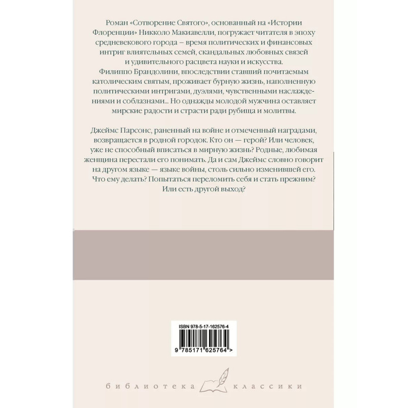 Роман "Сотворение Святого", основанный на "Истории Флоренции" Никколо Макиавелли, погружает читателя в эпоху средневекового города время политических и финансовых интриг влиятельных семей, скандальных любовных связей и удивительного расцвета науки и искусства. Филиппо Брандолини, впоследствии ставший почитаемым католическим святым, проживает бурную жизнь, наполненную политическими интригами, дуэлями, чувственными наслаждениями и соблазнами... Но однажды молодой мужчина оставляет мирские радости и страсти ради рубища и молитвы. Джеймс Парсонс, раненный на войне и отмеченный наградами, возвращается в родной городок. Кто он герой? Или человек, уже не способный вписаться в мирную жизнь? Родные, любимая женщина перестали его понимать. Да и сам Джеймс словно говорит на другом языке языке войны, столь сильно изменившей его. Что ему делать? Попытаться переломить себя и стать прежним? Или есть другой выход?