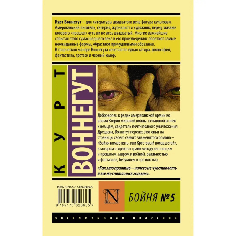 Доброволец в рядах американской армии во время Второй мировой войны, попавший в плен к немцам, свидетель почти полного уничтожения Дрездена, Воннегут перенес этот опыт на страницы своего самого знаменитого романа "Бойня номер пять, или Крестовый поход детей", в котором стираются грани между настоящим и прошлым, миром и войной, реальностью и фантазией, безумием и трезвостью.
