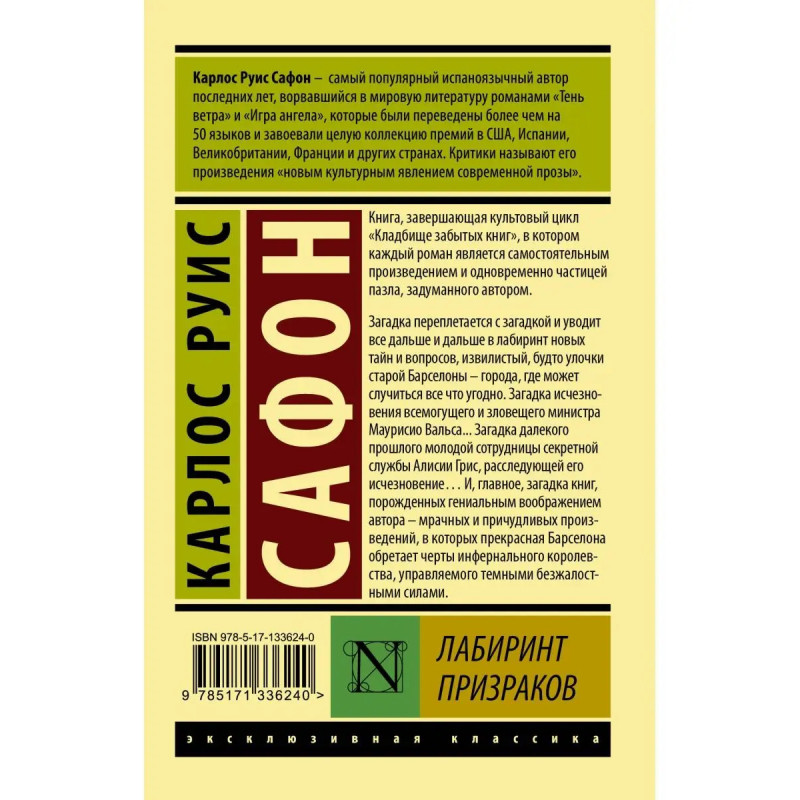 Последняя, завершающая книга культового цикла Карлоса Руиса Сафона "Кладбище Забытых книг", в который входят романы "Тень ветра", "Игра ангела" и "Узник неба". Загадка переплетается с загадкой и уводит все дальше и дальше в лабиринт новых тайн и вопросов, извилистый, будто улочки старой Барселоны города, где может случиться все что угодно. Загадка исчезновения всемогущего и зловещего министра Маурисио Вальса... Загадка далекого прошлого молодой сотрудницы секретной службы Алисии Грис, расследующей его исчезновение И, главное, загадка книг, порожденных гениальным воображением их автора мрачных и причудливых произведений, в которых прекрасная Барселона обретает черты инфернального королевства, управляемого темными безжалостными силами.