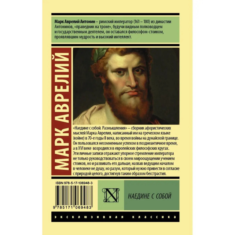 "Наедине с собой. Размышления" сборник афористических мыслей Марка Аврелия, написанный им на греческом языке (койне) в 7-е годы II века во время войны на дунайской границе. Он пользовался несомненным успехом в позднеантичное время, а в XVI веке возродился в европейских философских кругах. Эти личные записи отражают упорное стремление императора не только руководствоваться в своем мироощущении учением стоиков, но и развивать его дальше, назвав ведущим началом в человеке не душу, но разум, который нужно привести в согласие с природой целого, достигнув таким образом бесстрастия.