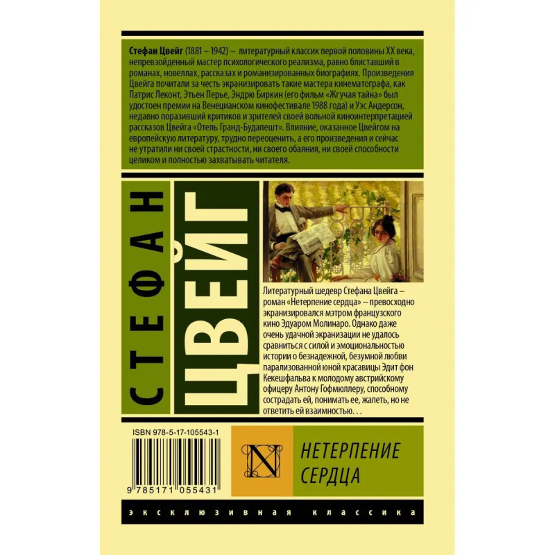 Литературный шедевр Стефана Цвейга роман "Нетерпение сердца" был превосходно экранизирован мэтром французского кино Эдуаром Молинаро. Однако даже очень удачной экранизации не удалось сравниться с силой и эмоциональностью истории о безнадежной, безумной любви парализованной юной красавицы Эдит фон Кекешфальва к молодому австрийскому офицеру Антону Гофмюллеру, способному сострадать ей, понимать ее, жалеть, но не ответить ей взаимностью