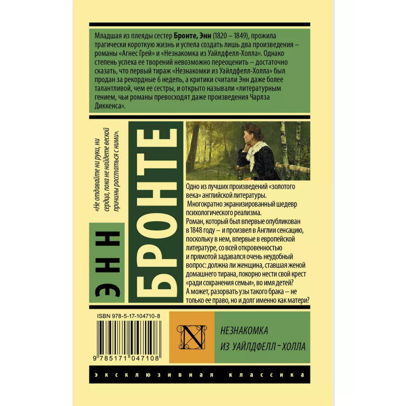 Незнакомка из Уайлдфелл-Холла. Одно из лучших произведений "золотого века" английской литературы. Многократно экранизированный шедевр психологического реализма. Роман, который был впервые опубликован в 1848 году, - и произвел в Англии сенсацию, поскольку в нем, впервые в европейской литературе, со всей откровенностью и прямотой, задавался очень неудобный вопрос: должна ли женщина, ставшая женой домашнего тирана, покорно нести свой крест "ради сохранения семьи", во имя детей? А может, разорвать узы такого брака - не только ее право, но и долг именно как матери? Вопрос, который, увы, для многих женщин во всем мире сохраняет актуальность и сейчас.