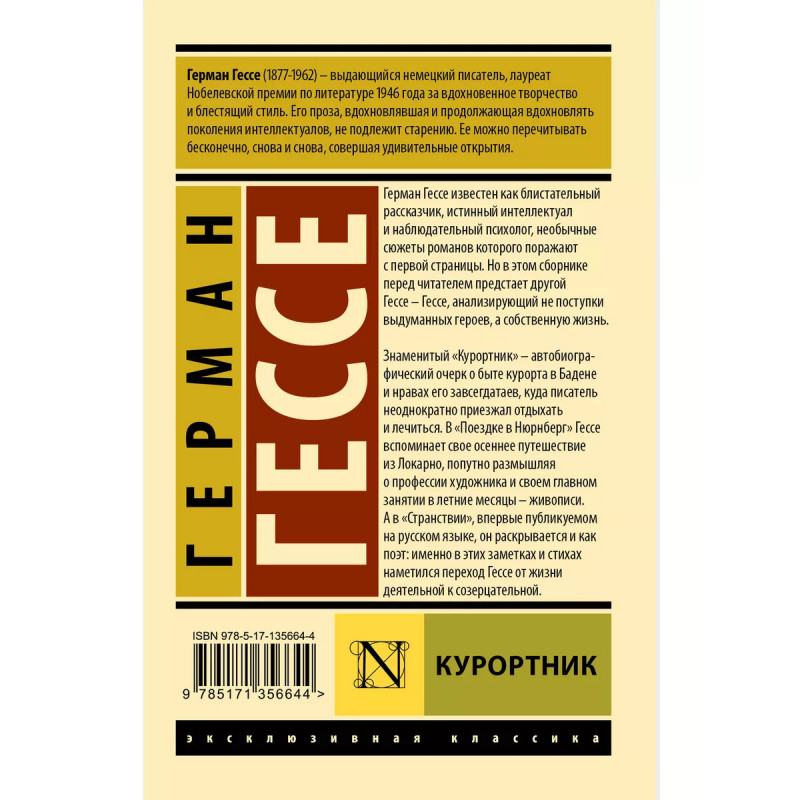 Герман Гессе известен как блистательный рассказчик, истинный интеллектуал и наблюдательный психолог, необычные сюжеты романов которого поражают с первой страницы. Но в этом сборнике перед читателем предстает другой Гессе Гессе, анализирующий не поступки выдуманных героев, а собственную жизнь. Знаменитый "Курортник" автобиографический очерк о быте курорта в Бадене и нравах его завсегдатаев, куда писатель неоднократно приезжал отдыхать и лечиться. В "Поездке в Нюрнберг" Гессе вспоминает свое осеннее путешествие из Локарно, попутно размышляя о профессии художника и своем главном занятии в летние месяцы живописи. А в "Странствии", впервые публикуемом на русском языке, он раскрывается и как поэт: именно в этих заметках и стихах наметился переход Гессе от жизни деятельной к созерцательной.
