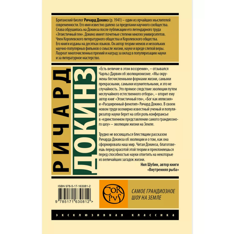 Эволюция это не сложный процесс, который происходит в труднопонимаемых глубинах миллиардов лет. Это процесс, который мы можем наблюдать в нашей жизни, каждый день. В книге Самое грандиозное шоу на земле. Доказательства эволюции Ричард Докинз предлагает читателям взглянуть на эволюцию по-новому. Он утверждает, что эти процессы не так уж сложны и непонятны, как кажется, они происходят прямо у нас на глазах каждый день. Автор призывает обратить внимание на многообразие живых организмов вокруг нас и рассмотреть их как результат эволюционных изменений, которые происходят в реальном времени. Докинз опубликовал множество научных работ и издал длинный список книг, в которых представляет эволюцию с разных точек зрения: Эгоистичный ген, Расширенный фенотип, Бог как иллюзия, Слепой часовщик, Река, выходящая из Эдема и многие другие. Книга Самое грандиозное шоу на Земле была издана в 2009 году и получила высокую оценку читателей, став бестселлером.