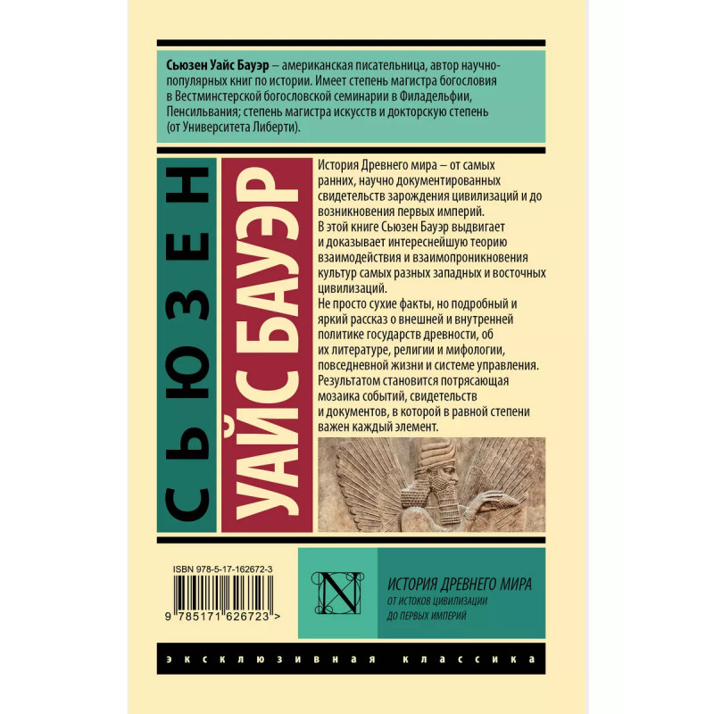 Сьюзен Уайс Бауэр - американская писательница, автор научно-популярных книг по истории. Имеет степень магистра богословия от Вестминстерской богословской семинарии в Филадельфии, Пенсильвания; степень магистра искусств и докторскую степень (от университета Либерти). История Древнего мира от самых ранних, научно документирован-ных свидетельств зарождения цивилизаций и до возникновения первых империй. В этой книге Сьюзен Бауэр выдвигает и доказывает интереснейшую теорию взаимодействия и взаимопроникновения культур самых разных западных и восточных цивилизаций. Не просто сухие факты, но подробный и яркий рассказ о внешней и внутренней политике государств древности, об их литературе, религии и мифологии, повседневной жизни и системе управления. Результатом становится потрясающая мозаика событий, свидетельств и документов, в которой в равной степени важен каждый элемент.