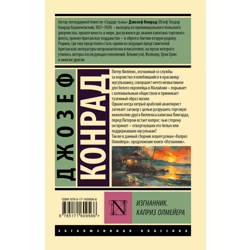 Питер Виллемс, изгнанный со службы за воровство и влюбившийся в красавицу мусульманку, совершает нечто немыслимое для белого европейца в Малайзии порывает с колониальным обществом и принимает туземный образ жизни. Однако когда хитрый арабский авантюрист затевает заговор с целью разрушить торговую монополию друга Виллемса капитана Лингарда, перед Питером встает вопрос: чью сторону он примет отвергнувших его белых или поддержавших мусульман? Также в данный сборник вошел роман "Каприз Олмейера", продолжение книги "Изгнанник".