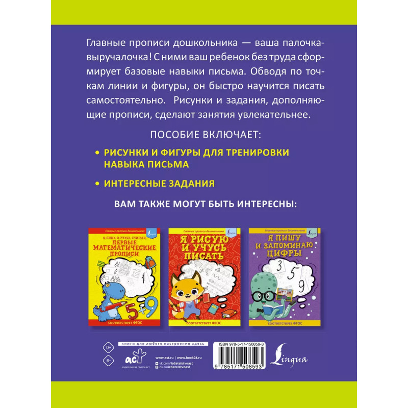 Я готовлю руку к письму: первые прописи (соответствует ФГОС). В этом издании собраны задания для комплексного развития навыков письма у детей. В книгу вошли задания, направленные на отработку написания различных геометрических фигур по точкам. С помощью пособия ребёнок научится ровному написанию различных элементов письма, что поможет ему впоследствии освоить написание букв алфавита. Издание будет полезно родителям для подготовки детей к школе, а также может использоваться как вспомогательный материал в образовательных учреждениях.