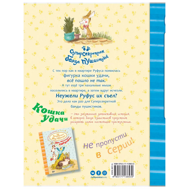 Кошка удачи. С тех пор как в квартире Руфуса появилась фигурка кошки удачи, всё пошло не так. А тут ещё три нахальные мыши поселились в квартире, а затем вдруг исчезли. Неужели Руфус их съел? Это дело как раз для Суперсекретной банды пушистиков. "Кошка удачи" - это запутанная детективная история, в которой банде пушистиков предстоит раскрыть самое настоящее преступление.