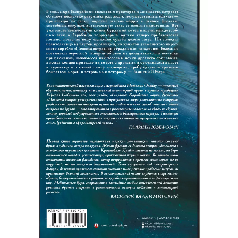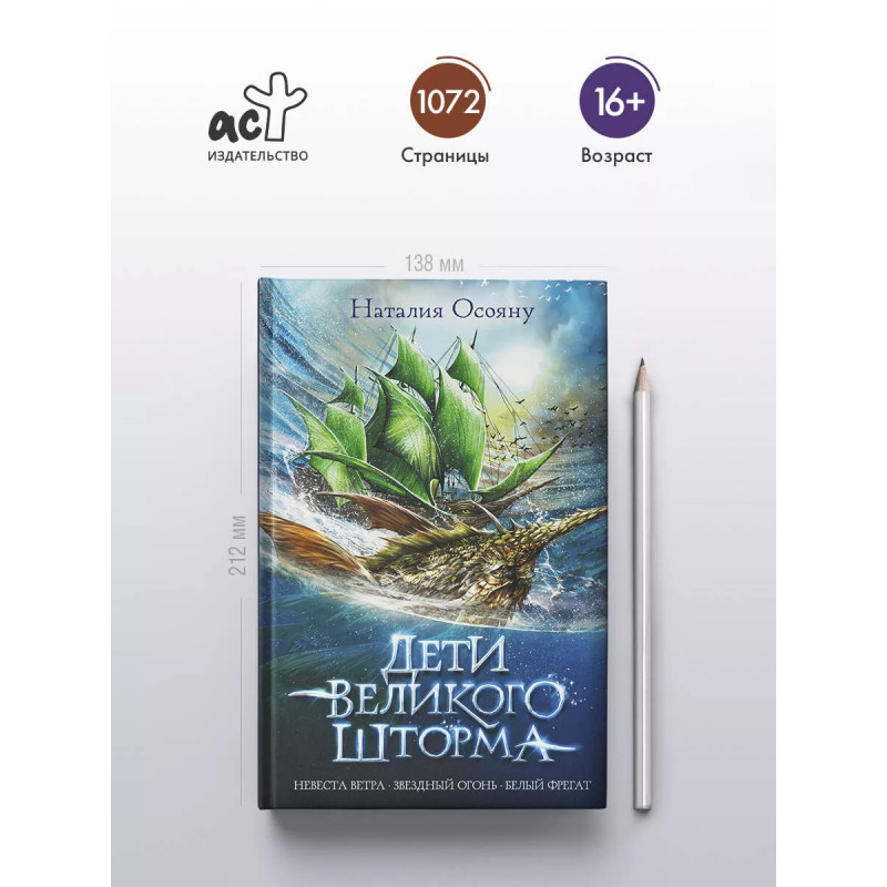 Трилогия Дети Великого Шторма самобытное, оригинальное и увлекательное фэнтези в лучших традициях приключенческой фантастики. Понравится поклонникам романа Гавань Ветров Джорджа Р. Р. Мартина, циклов Левиафан Скотта Вестерфельда, Сага о живых кораблях Робина Хобба и Всадники Перна Энн Маккефри. Все три романа трилогии Дети Великого Шторма в одной книге: Невеста ветра, Звездный огонь и Белый фрегат. Тысячелетиями на океанских просторах бушуют войны за острова, а жажда власти отравляет сердца. И вот, когда кажется, что тьма поглотила все вокруг, судьба мира вверяется трем душам, не подозревающим о своей роли. Молодая целительница, чей дар исцеления способен укротить любую болезнь. Капитан пиратского корабля, чей отважный дух не сломлен ни бурями, ни врагами. И император, чей трон омрачен загадочной болезнью. Их пути, казалось бы, не пересекаются, но поиски древнего сокровища сплетают их судьбы воедино.